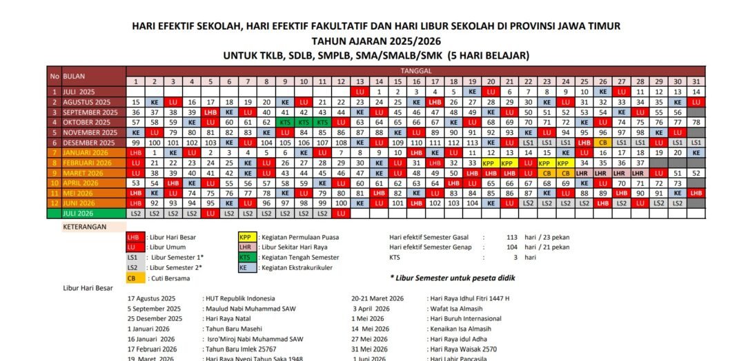 TAJUKNASIONAL.COM – Dinas Pendidikan Provinsi Jawa Barat telah merilis Kalender Pendidikan Tahun Ajaran 2025/2026 yang berlaku untuk seluruh jenjang pendidikan, mulai dari TK, SD, SMP, SMA, SMK hingga SLB.