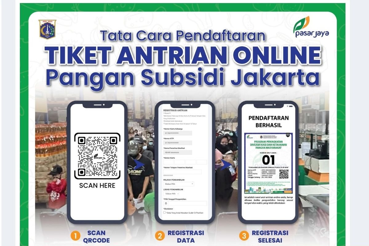 Pendaftaran dilakukan melalui laman resmi antrianpanganbersubsidi.pasarjaya.co.id, sehingga seluruh proses bisa diselesaikan dari rumah.