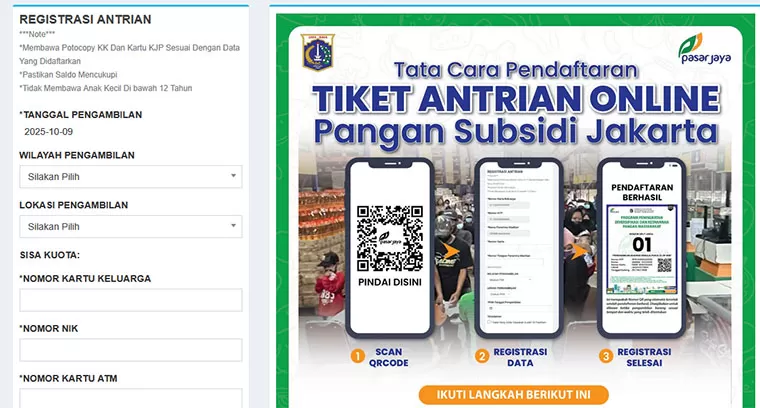 Masyarakat yang terdaftar sebagai penerima manfaat dapat memperoleh tiket antrean subsidi pangan secara daring melalui laman resmi https://antrianpanganbersubsidi.pasarjaya.co.id.