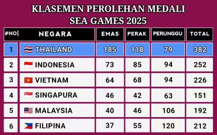 Sementara itu, tuan rumah Thailand masih nyaman di puncak klasemen dengan raihan 186 medali emas dan sulit terkejar oleh negara lain.