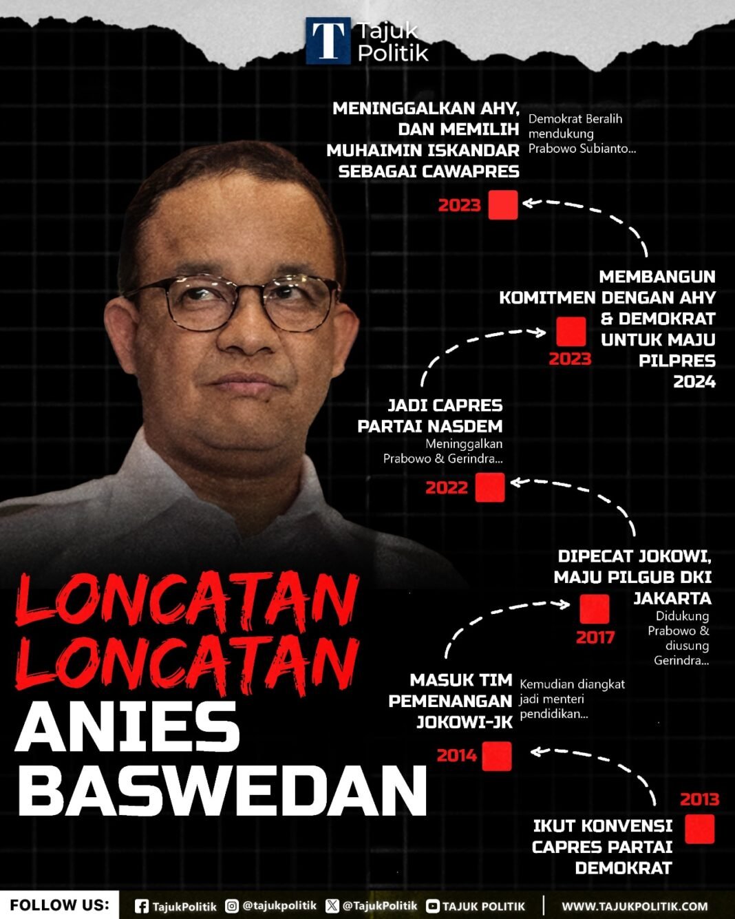 Anies Baswedan dikenal sebagai politisi yang sering bergonta-ganti dukungan politik. Mulai dari ikut konvensi presiden yang dilakukan Partai Demokrat hingga saat ini menjadi capres yang diusung Partai Nasdem, PKS dan PKB.