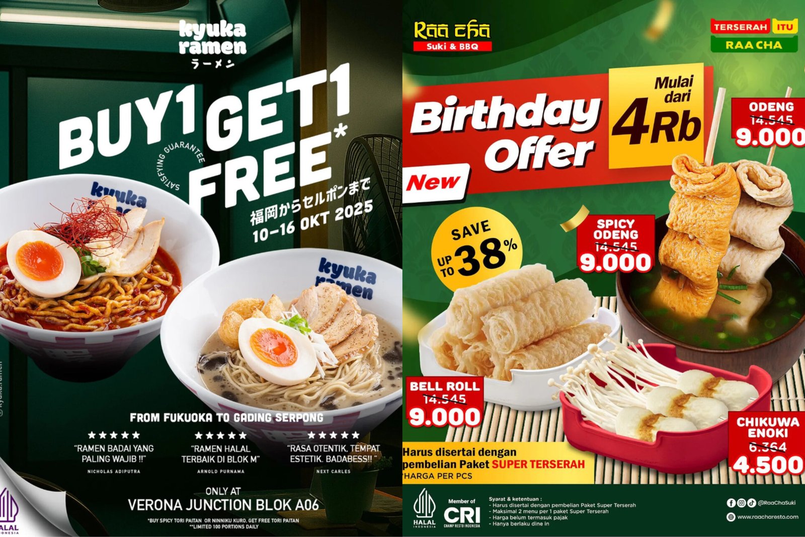 Kyuka Ramen menawarkan promo Buy 1 Get 1 yang berlaku pada periode 10–16 Oktober 2025. Promo ini hanya bisa dinikmati di Kyuka Ramen Gading Serpong, Verona Junction Blok A No.6.