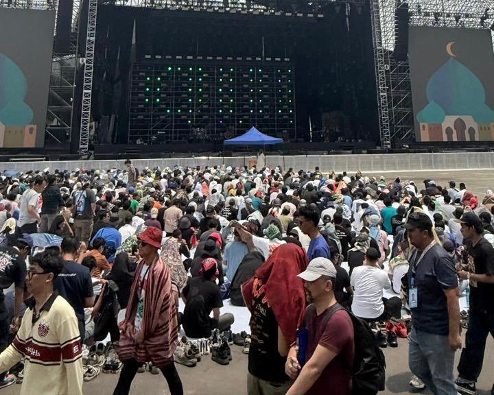 Fenomena unik ini pun ramai diperbincangkan di media sosial. Banyak warganet menyebutnya sebagai “salat Jumat dalam keadaan kalcer,” karena mayoritas jamaah masih mengenakan outfit khas mereka untuk menonton konser.