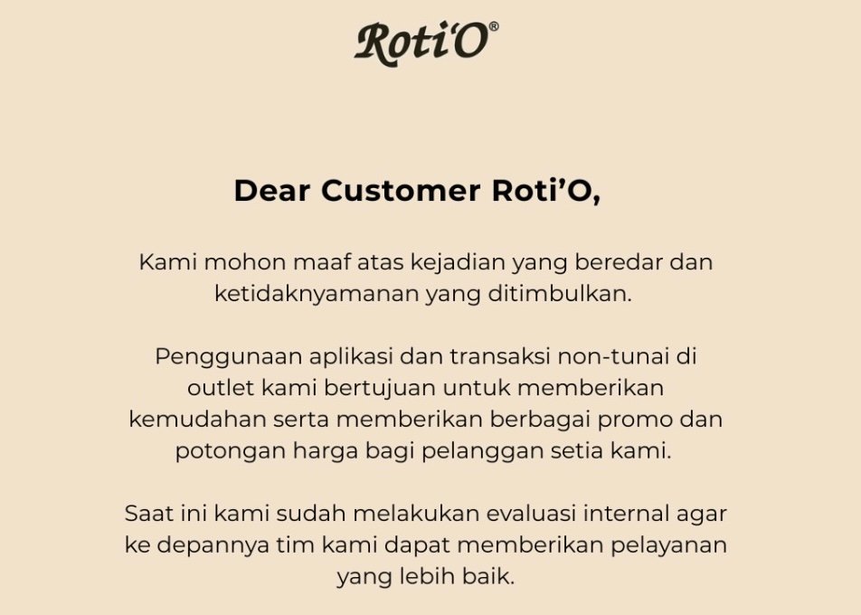 Menanggapi polemik tersebut, pihak manajemen Roti’O menyampaikan permohonan maaf kepada publik.