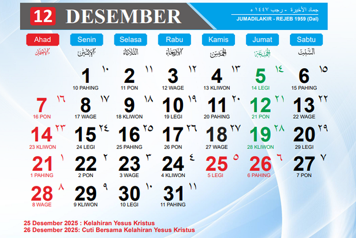 - Kamis, 25 Desember 2025: Libur Nasional Hari Raya Natal