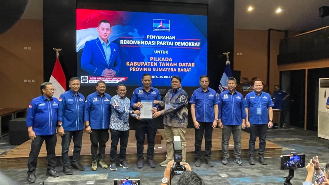 Tajuk Nasional – Ketua Umum Partai Demokrat, Agus Harimurti Yudhoyono (AHY) menyerahkan surat rekomendasi kepada pasangan calon (paslon) kepala daerah untuk wilayah pemilihan tingkat Kabupaten Tanah Datar, Sumatera Barat. Surat diberikan langsung dalam bentuk B.1-KWK kepada paslon Eka Putra-Ahmad Fadli Suir Syam.