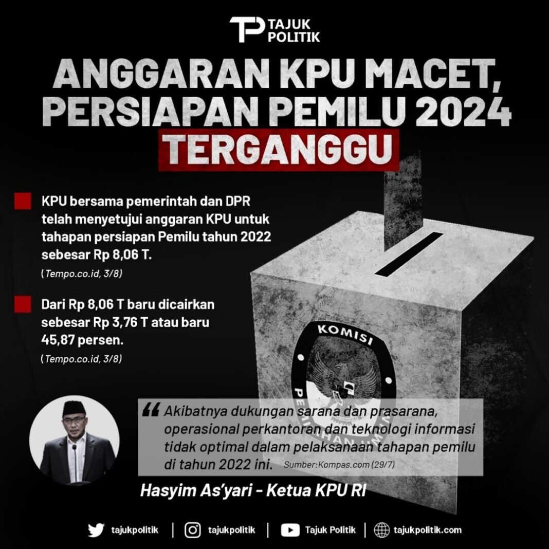 Anggaran Komisi Pemilihan Umum (KPU) dalam melakukan tahapan persiapan Pemilu 2024 macet. Pemerintah belum mengucurkan dana secara penuh untuk mendukung persiapan KPU.