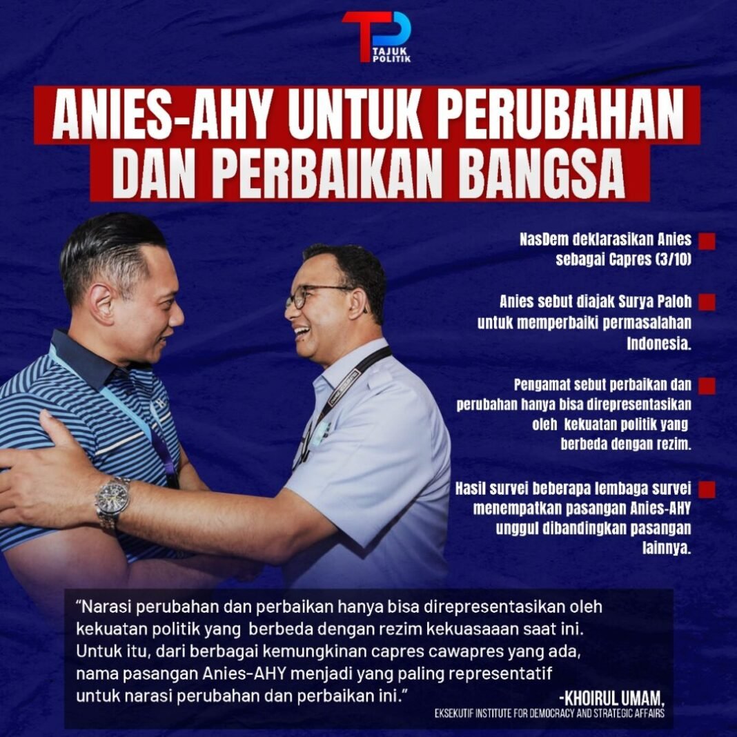 Dengan mengusung tagline ‘Perubahan dan Perbaikan’, Anies-AHY diharapkan mampu memperbaiki kondisi bangsa.