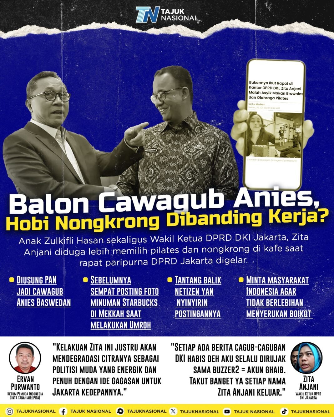 Anak Zulkifli Hasan sekaligus Wakil Ketua DPRD DKI Jakarta, Zita Anjani diduga lebih memilih pilates dan nongkrong di kafe saat rapat paripurna DPRD Jakarta digelar.