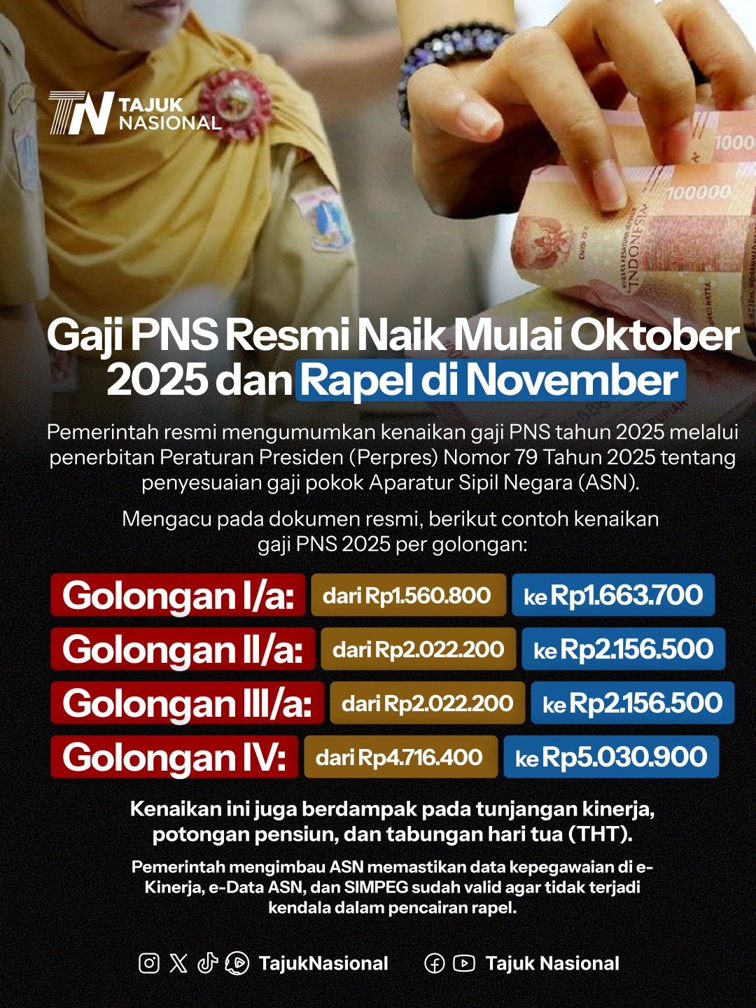 Kenaikan mulai berlaku per Oktober 2025, sementara rapel gaji akan dicairkan pada November 2025.