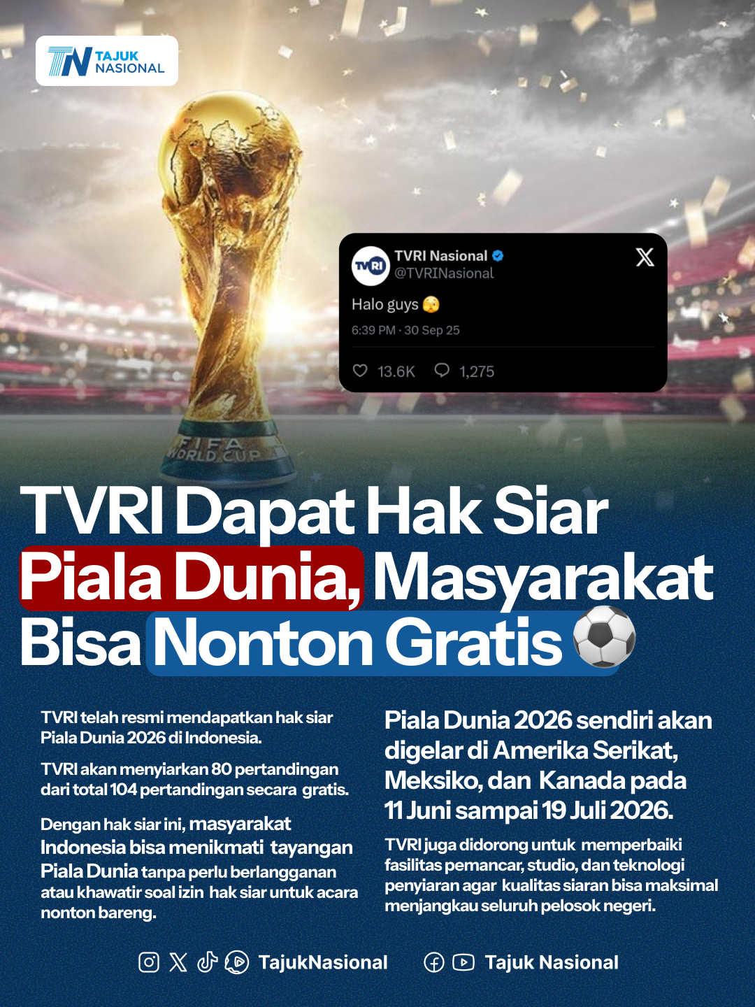 Kabar gembira datang bagi pecinta sepak bola Tanah Air. TVRI resmi memperoleh hak siar Piala Dunia 2026 di Indonesia. Dengan perolehan ini, masyarakat Indonesia dapat menyaksikan siaran langsung Piala Dunia secara gratis, tanpa perlu membayar biaya langganan.