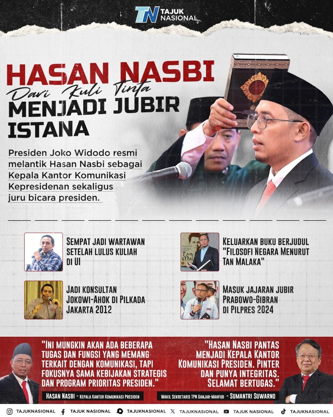Presiden Joko Widodo resmi melantik Hasan Nasbi sebagai Kepala Kantor Komunikasi Kepresidenan sekaligus juru bicara presiden.