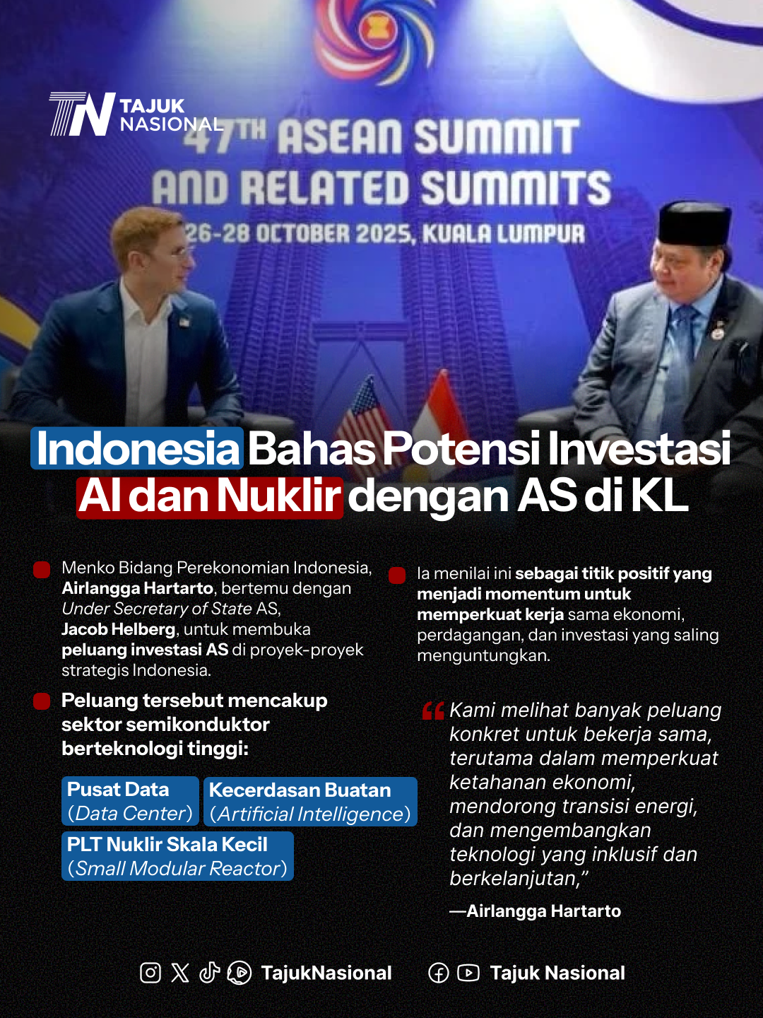 Dalam pertemuan di sela-sela KTT ASEAN ke-47 di Kuala Lumpur, Menteri Koordinator Bidang Perekonomian Airlangga Hartarto bertemu dengan Under Secretary of State AS, Jacob Helberg, untuk membahas peluang investasi Amerika Serikat di berbagai proyek strategis Indonesia.