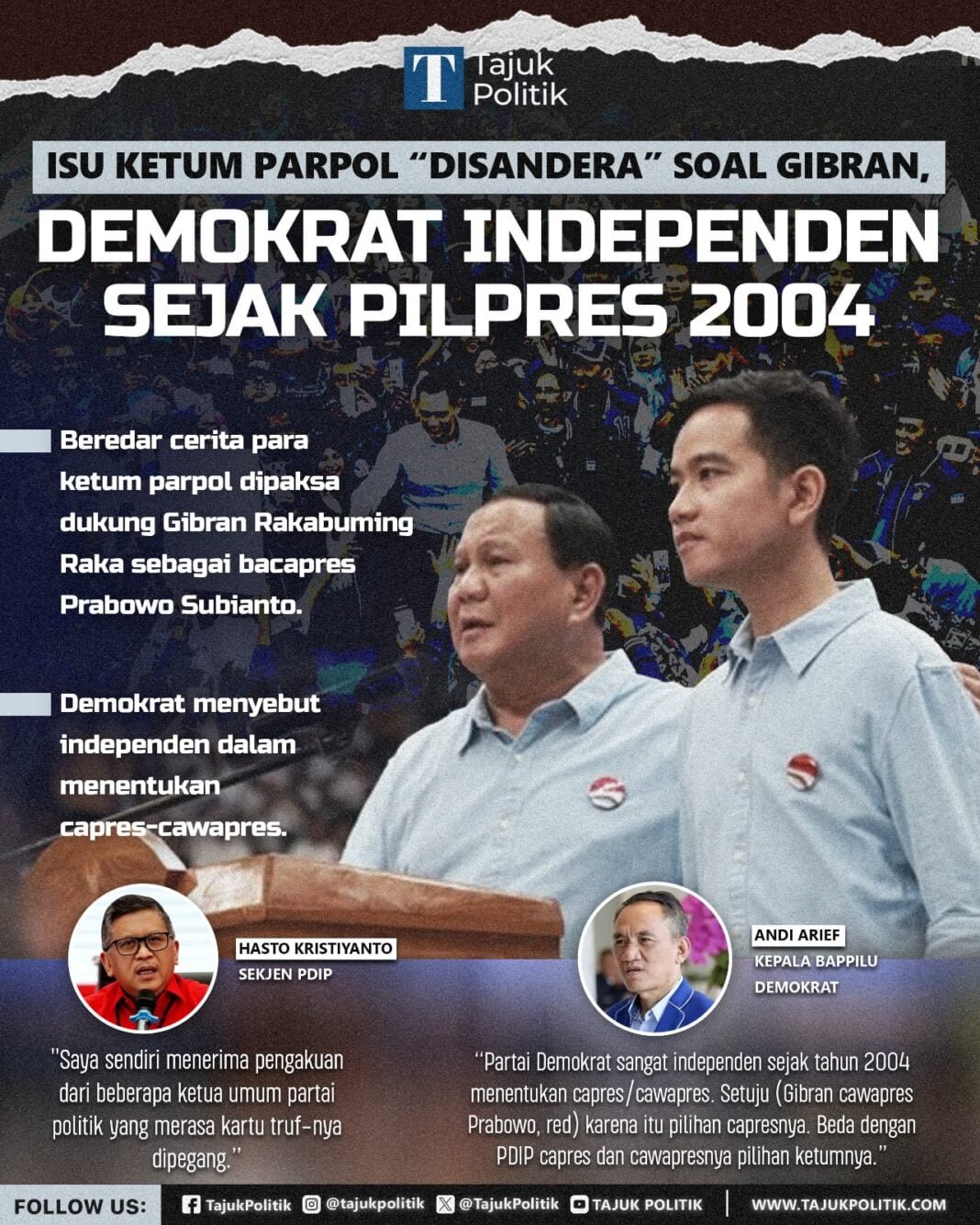 Isu Ketum Parpol “Disandera” Soal Gibran, Demokrat Independen Sejak Pilpres 2004GRAFIS01/11/2023Updated: 01/11/2023By Putra Beredar cerita para ketum parpol dipaksa dukung Gibran Rakabuming Raka sebagai bacawapres Prabowo Subianto. Demokrat menyebut independen dalam menentukan capres-cawapres.BagikanFacebookTwitterPinterestWhatsApp - Advertisement - - Advertisement -TagsDemokratBerita Terbaru LIFESTYLEValentine 2026, Promo Alfamart Terbaru Ini bisa Belanja Coklat Hadiah Lebih Hemat Ishak - 10/02/2026 - Advertisement - Berita Lainnya DPR RI-DPD RIRuby Syiffadia: Perempuan dan Anak Muda Harus Jadi Pilar Perdamaian Dunia Jhon - 14/05/2025 NASIONALAHY Apresiasi Kader Demokrat Cepat Tanggap Bantu Korban Gempa Cianjur Jhon - 24/11/2022 PEMILUPartai Demokrat Resmi Deklarasikan Bambang Iman Santoso sebagai Bakal Calon Wali Kota Metro untuk Pilkada 2024 Jhon - 05/08/2024 Rekomendasi Untuk AndaSelengkapnya NASIONALBertemu di Acara Global Summit, SBY Ungkap Kedekatan dengan Ban Ki-moon Putra - 01/12/2022 NASIONALBikin Acara Kumpul Relawan, PKS : Turunkan Level dan Derajat Kepemimpinan Jokowi Putra - 29/11/2022 NASIONALSpesial Ultah Prabowo, Menu MBG Kompak Jadi Nasi Goreng dan Telur Ceplok Ishak - 17/10/2025 NASIONALJalankan Perintah AHY, BPPM DPP Partai Demokrat Salurkan Sembako untuk Korban Banjir di Bogor Putra - 13/10/2022 BERITA VIRALBNPB Siapkan Dua Opsi Relokasi untuk Warga Terdampak Erupsi Gunung Lewotobi Laki-Laki Putra - 21/11/2024 - Advertisement - - Advertisement -TINGGALKAN KOMENTAR Batal membalasKomentar:Silakan masukkan komentar anda! Nama:*Silakan masukkan nama Anda di sini Email:*Anda telah memasukkan alamat email yang salah!Silakan masukkan alamat email Anda di sini Website: Simpan nama, email, dan situs web saya di browser ini untuk lain kali saya berkomentar. Δ