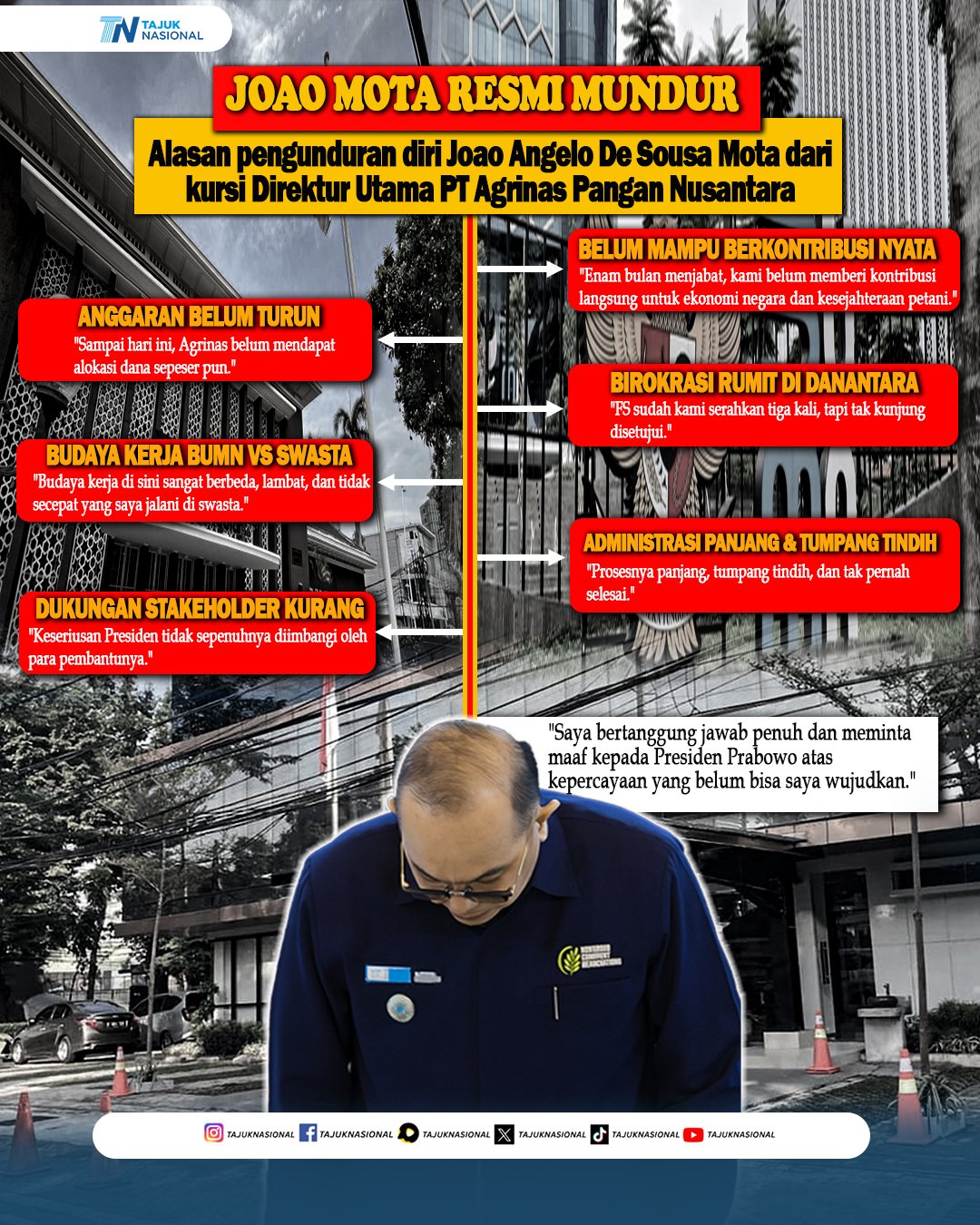 Dalam pernyataannya, Joao Mota mengungkap beberapa faktor yang membuatnya memilih untuk mundur. Pertama, anggaran belum turun sejak ia menjabat. “Sampai hari ini, Agrinas belum mendapat alokasi dana sepeser pun,” ujarnya.