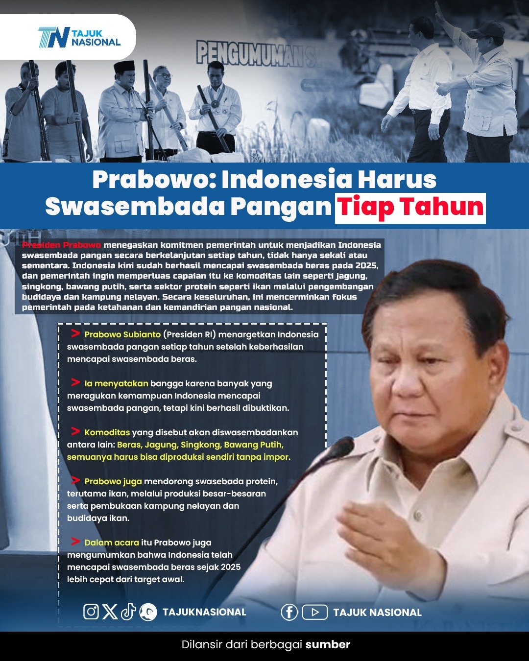 Presiden Republik Indonesia Prabowo Subianto menegaskan komitmen kuat pemerintah untuk mewujudkan swasembada pangan tiap tahun secara berkelanjutan. Menurut Prabowo, swasembada pangan tidak boleh bersifat sementara atau insidental, melainkan harus menjadi sistem nasional yang kokoh demi ketahanan dan kemandirian bangsa. Pernyataan ini disampaikan setelah Indonesia dinyatakan berhasil mencapai swasembada beras pada 2025, lebih cepat dari target awal.