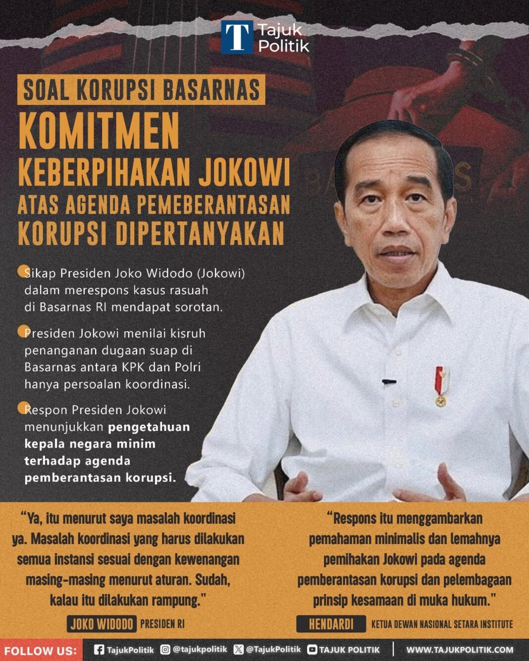 Tajuk Politik – Sikap Presiden Joko Widodo (Jokowi) dalam merespons kasus rasuah di Basarnas RI mendapat sorotan.