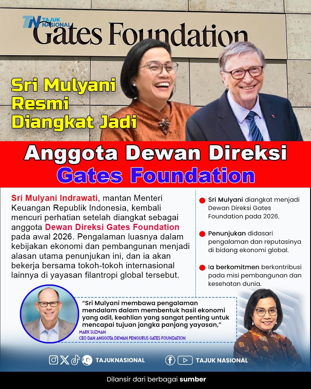 Mantan Menteri Keuangan Republik Indonesia tersebut akan bergabung dengan jajaran tokoh global yang terlibat dalam pengambilan keputusan strategis di yayasan filantropi milik Bill Gates itu. Gates Foundation selama ini dikenal aktif dalam isu kesehatan global, pengentasan kemiskinan, pendidikan, serta pembangunan berkelanjutan di berbagai negara berkembang.